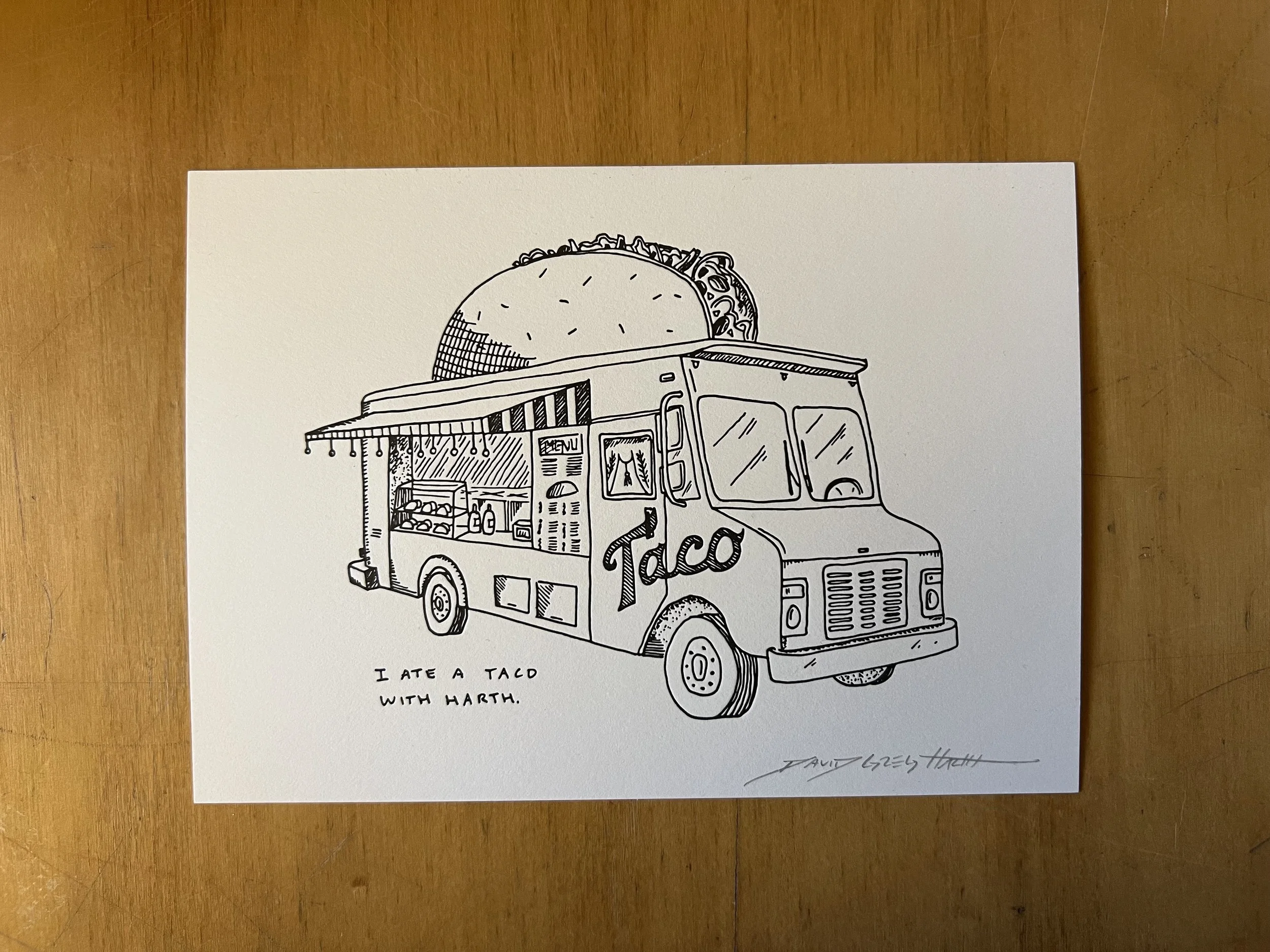 The signed & dated letterpress edition a participant would get after having a taco with me. (On a table)