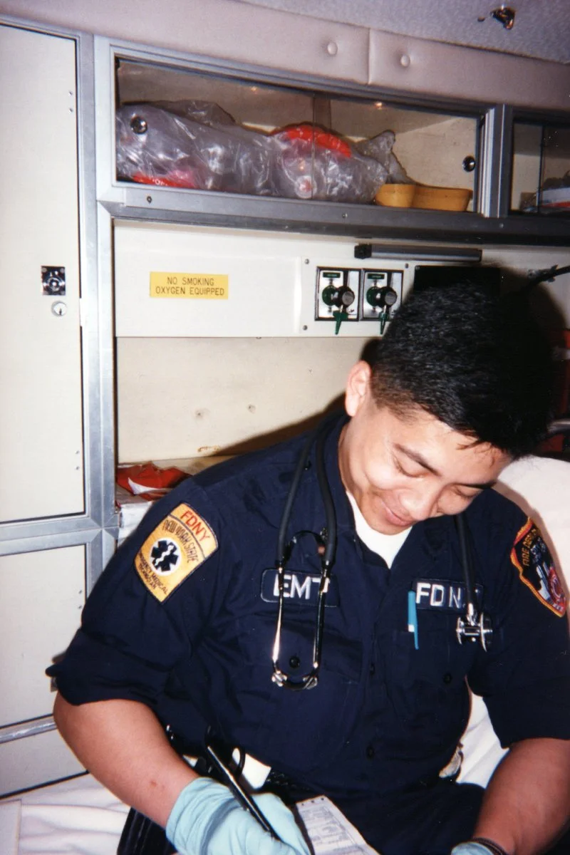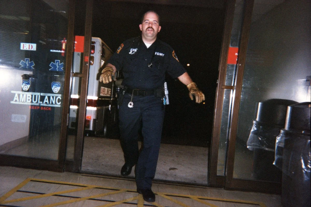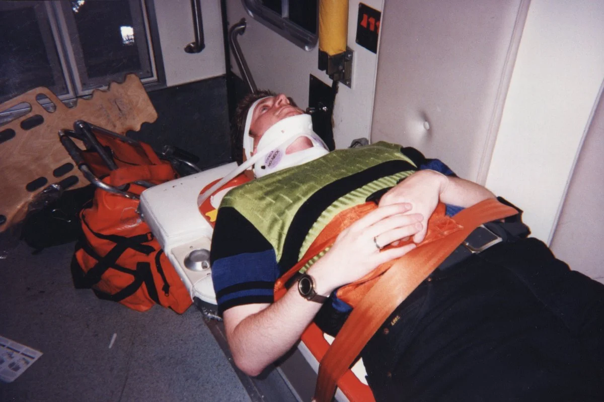 After attending the June 3rd, 1997 Popmart U2 concert at Giants Stadium in East Rutherford, New Jersey, I was driving back to my apartment in Manhattan. After midnight, on June 4th, at the intersection of 9th Avenue & West 17th street I got into a huge car crash. A truck ran the red light going West bound on 17th street just as I entered the intersection going south on 9th Avenue. I walked away unharmed as did my passenger. My car was totaled. The only camera I had on me was a disposable camera. I was animate about documenting myself. I asked the EMT technician to snap a photo of me as I lied on the gurney in the ambulance. The other two photos are of the EMT technician. The photo of my totaled car was taken the next day at the tow lot.